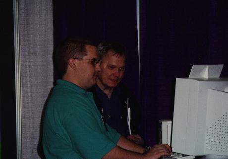Linus Torvalds and Jon "maddog" Hall holding SSC's penguin beer mug