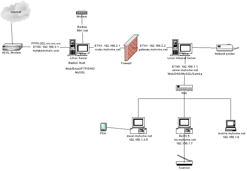 OK I subscribed to the broadband service finally. It takes two weeks to arrange a technical guy to install the splitter and ADSL modem. Actually I can do it myself but they don't want me to. Anyway this is a good time to build the network and prepair for the high speed connection. Before actually building the network, it is better to think about the topology first. I make use of my spare old hardware and spent some money to build two linux box. One linux box will be the baston host running Apache web server, ftp server, email server and MySQL database server. The baston host will act as an exterior router routing traffic between the internet and the intranet. The other linux box will be the Intranet server hosting internal application and data. The intranet box will act as an interior router. Someone asked, why two linux box? Well, for security reason of course. Please refer to your technical books about firewalling for details explaination. Figure 1 shows the network diagram of my home network.